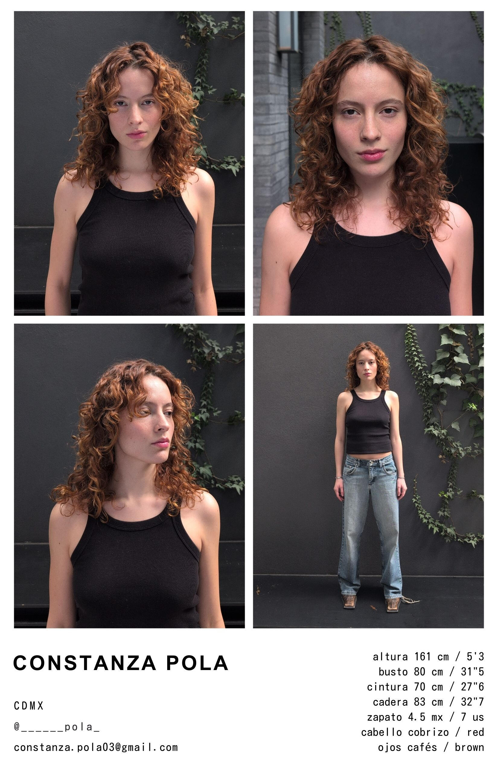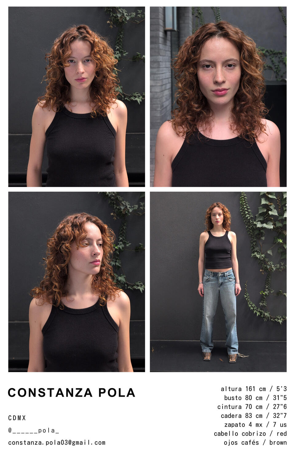 altura 160 cm / 5’3” busto 80 cm / 31.5” cintura 70 cm / 27.6” cadera 83 cm / 32.7” zapato 4 mx / 7 us cabello pelirrojo ojos cafés